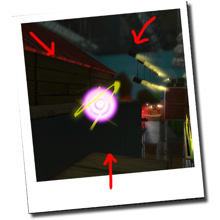 - On top of a (relatively) short stack of crates just ahead and above from the start. Can be reached with a criss-cross wall-jump from the ground behind it.
